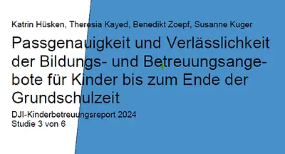In Heft 3 des DJI-Kinderbetreuungsreports 2024 wird die fehlende Passgenauigkeit und Verlässlichkeit der Bildungs- und Betreuungsangebote für Kinder bis zum Ende der Grundschulzeit für das Erhebungsjahr 2023 thematisiert. Dabei werden unter anderem sowohl die Häufigkeit fehlender Passung im üblichen Betreuungsalltag als auch ungeplante Schließtage für alle Kinder bis zum Ende der Grundschulzeit sowie die Ferienbetreuung für Grundschulkinder betrachtet (Zusammenspiel von Bedarf, Angebot und Nutzung; Dauer der gewünschten und genutzten Ferienbetreuung).